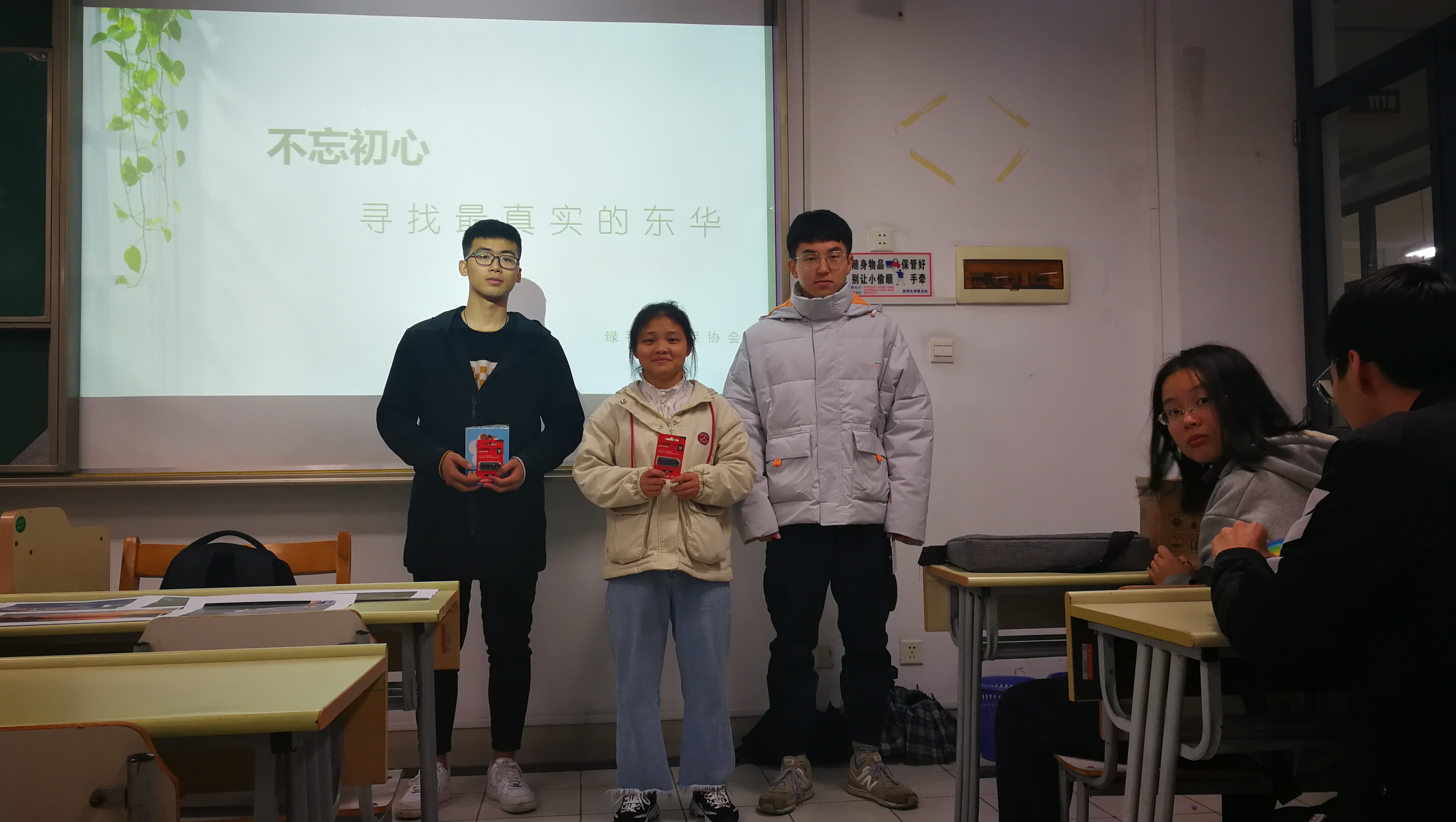 11月30日18点,排名前20的同学冒着绵软却刺骨的细雨来到了1118教室,教室的桌子上已经摆好了他们的参赛作品。随着人员的到来,这方空间逐渐暖和了起来,一如教室里的气氛。主持人介绍了活动的基本内容之后,话锋一转,在屏幕上放出了几张不一样的照片:湖边的黑天鹅在拨弄着水中的垃圾试图寻找食物;草丛中废弃的塑料瓶;宿舍楼下堆放着的垃圾……这是在学校光鲜亮丽的美好之下的阴影,但阴影一样不容忽视。