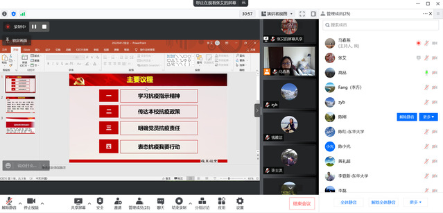 支部组织委员高品一直在学校疫情防控一线工作,作为学校疫情防控网格化管理的网格长,向支部党员们介绍了目前学校疫情防控形势、抗疫工作开展落实情况、学院近期对疫情防控工作的具体布置,以及教师志愿者的服务工作等情况。使党员深刻认识了高校疫情防控的特殊重要性和当前学校疫情防控的现实紧迫性。